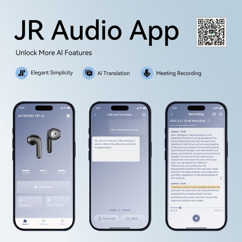 Wechseln Sie zwischen Arbeit, Anrufen und Spielen, ohne die Ohrhörer zu wechseln. JOYROOM JR-FB1 kombiniert echte kabellose Audioübertragung mit KI-gestützten Funktionen, die für die tägliche Produktivität und Unterhaltung entwickelt wurden. Verwenden Sie den Ein-Ohr-Modus, wenn Sie Ihre Umgebung wahrnehmen möchten, oder tragen Sie beide Ohrhörer für vollen Stereoklang. KI-Echtzeitübersetzung, Besprechungsaufzeichnung und KI-Zusammenfassungserstellung helfen Ihnen auf Reisen, beim Lernen und an arbeitsreichen Tagen, während die Sprachassistenzunterstützung Ihnen die Hände frei hält.
