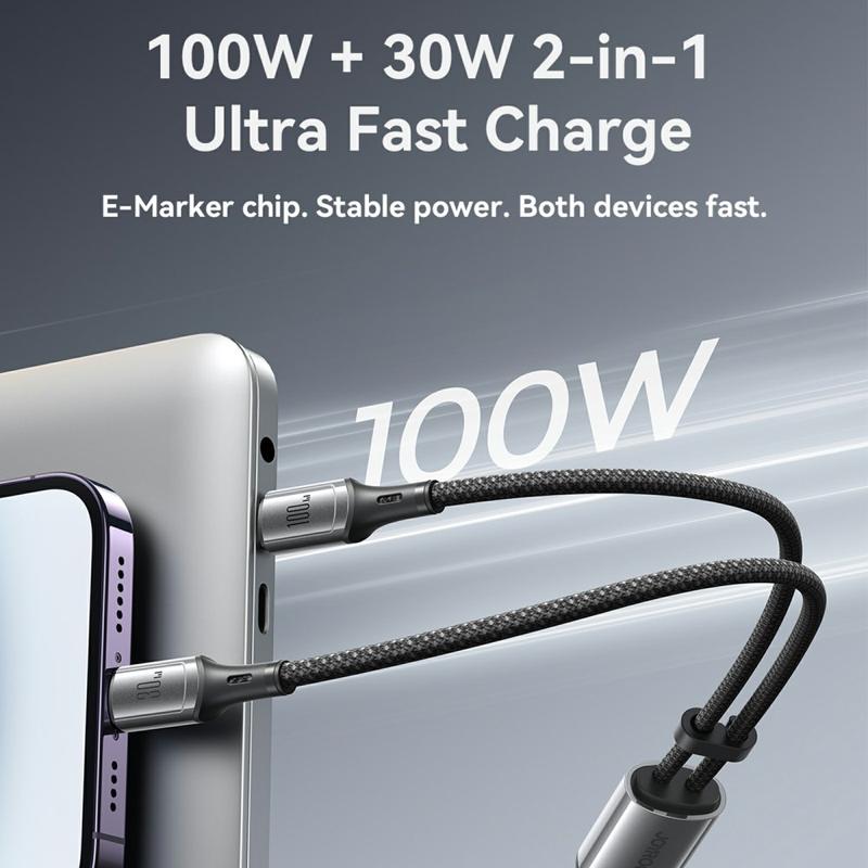 Laden und synchronisieren Sie mehr Geräte mit einem intelligenten Kabel. Das JOYROOM S-A57 Ladekabel mit zwei Anschlüssen kombiniert USB-C zu USB-C mit einem zusätzlichen Lightning-Anschluss und bietet so flexible Kompatibilität für verschiedene Geräte, ohne dass Sie mehrere Kabel mitführen müssen. Es unterstützt das schnelle Aufladen von kompatiblen USB-C-Geräten mit bis zu 100 W und bietet eine Datenübertragungsrate von bis zu 480 Mbit/s für die tägliche Synchronisierung. Das 1.5m lange Kabel mit robustem Nylongeflecht und ABS-Steckergehäuse eignet sich ideal für den Schreibtisch, das Sofa und für Reisen - für eine bequeme Reichweite ohne Kabelgewirr.
