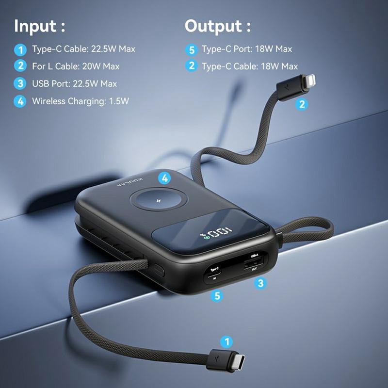 Die KUULAA KL-YD80 kombiniert hohe Kapazität, schnelles Aufladen und vielseitige Anschlussmöglichkeiten in einem schlanken Design. Die zwei integrierten Kabel und das intelligente digitale Display bieten Komfort und Effizienz und machen sie zu einer ausgezeichneten Wahl für Benutzer, die zuverlässige tragbare Energie suchen.