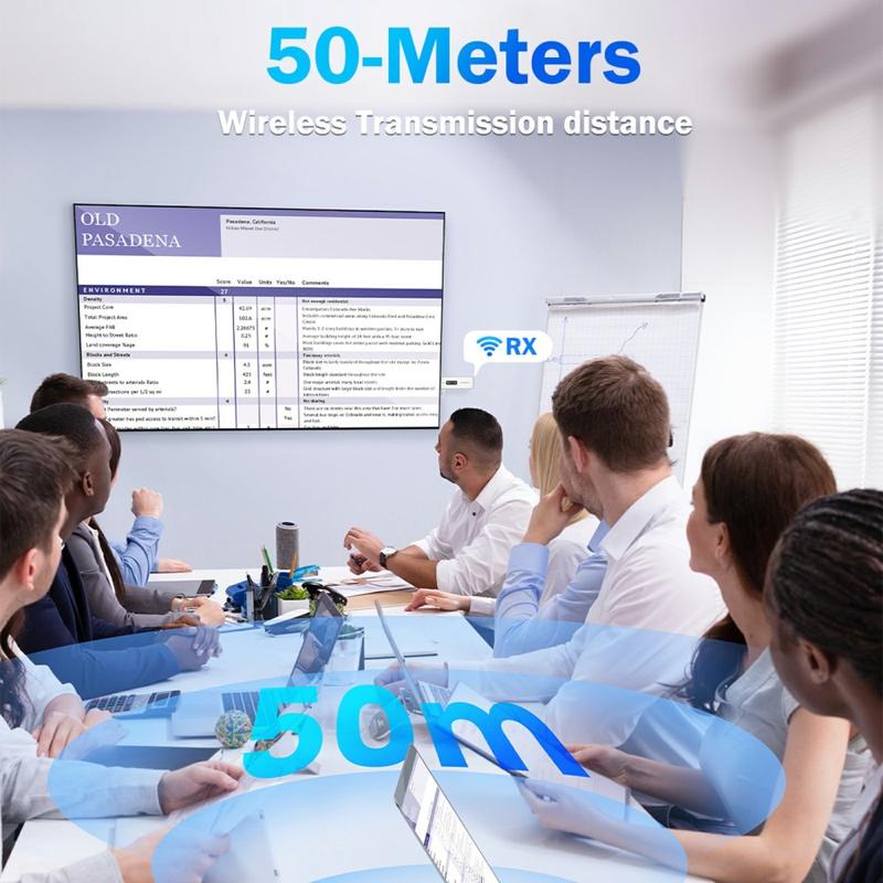 Das System unterstützt Videoübertragungen bis zu 1080P und sorgt für eine scharfe Bildqualität und zuverlässige Leistung für Bildschirme, Projektoren und Monitore. Es ist ideal für professionelle Präsentationen, Videowiedergabe und Bildschirmspiegelung.