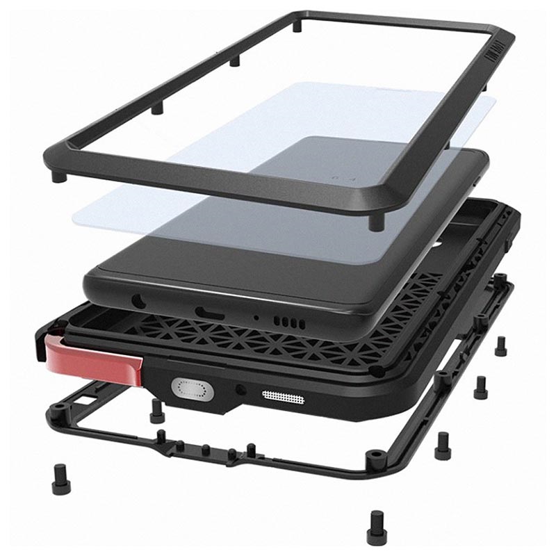 Das leistungsstarke Case verfügt über eine clevere Konstruktion, die Ihr Smartphone vor Beulen und Staub sowie Stößen schützt. Der Metallrahmen passt perfekt zum Samsung Galaxy S10+ und erhöht die Steifigkeit und Stoßfestigkeit des Geräts, während eine Schicht aus gehärtetem Glas den Bildschirm vor Kratzern schützt, ohne die Berührungsempfindlichkeit zu beeinträchtigen.