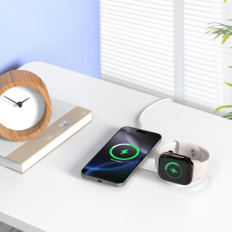 Laden Sie mehrere Geräte gleichzeitig mit dem 25-W-Hauptladepad und einem zweiten 5-W-Lademodul für Ohrhörer oder Smartwatches. Perfekt für einen aufgeräumten Schreibtisch, auf Reisen oder zum Aufladen auf dem Nachttisch.