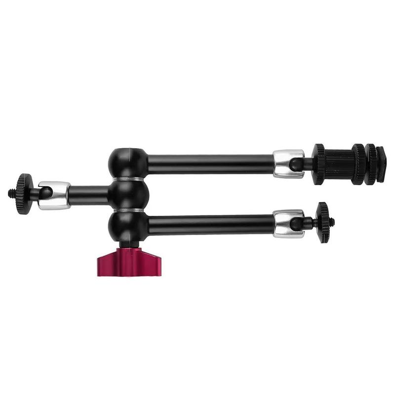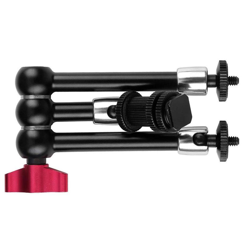 Die aus einer Aluminiumlegierung und Edelstahl gefertigte Halterung bietet eine stabile und langlebige Konstruktion mit einem Metallzahnrad-Design für eine sicherere Positionierung. Die 360°-Verstellung an allen Gelenken erleichtert die Feinjustierung der Winkel, während der Blitzschuh und die 1/4"-Befestigungshalterung eine breite Kompatibilität mit DSLR-Kameras und entsprechendem Zubehör gewährleisten. Rote Schnellverschlussgriffe ermöglichen eine schnelle Einrichtung und Neupositionierung ohne Werkzeug und helfen so, Ihren Arbeitsablauf während der Aufnahmen zu optimieren.