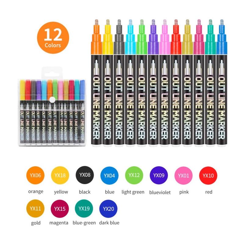12 Farben Doppellinien-Malstifte, darunter Orange, Gelb, Gold, Schwarz, Blau, Hellgrün, Blau-Violett, Rosa, Rot, Magenta, Blau-Grün, Dunkelblau