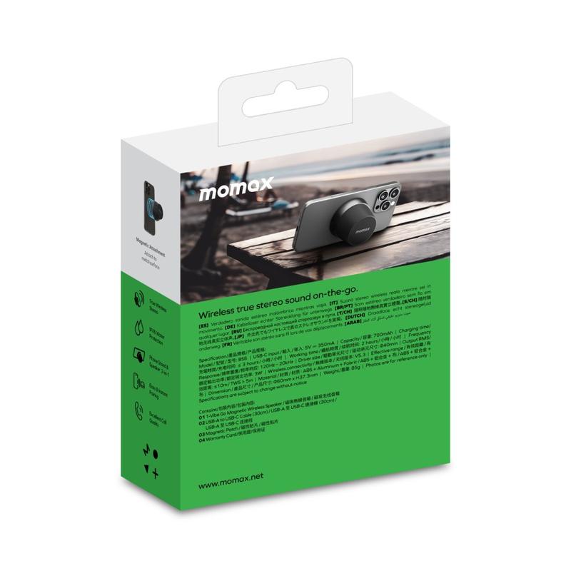 Der magnetische Mini-Bluetooth-Lautsprecher MOMAX 1-Vibe Go BS6 ist eine kompakte, vielseitige Audiolösung für die tägliche Unterhaltung zu Hause oder unterwegs. Sein ultra-mini magnetisches Design kombiniert einen tragbaren kabellosen Lautsprecher mit einem praktischen Handyhalter, sodass Sie Musik, Videos und Anrufe ganz einfach genießen können. Ausgestattet mit einem leistungsstarken 40-mm-Treiber und 360°-Soundausgabe liefert er beeindruckenden Klang in überraschend kleiner Form, während die Wasserdichtigkeit nach IPX6 ihn für den täglichen Gebrauch in verschiedenen Umgebungen geeignet macht.