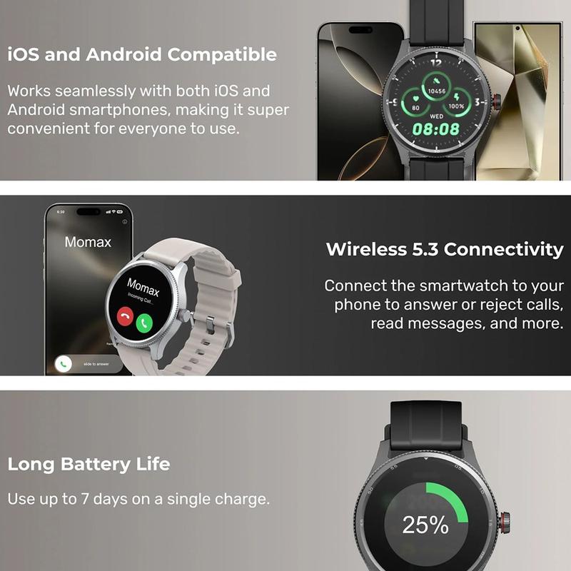 Die MOMAX 1-Wear ist ein starker Allrounder, wenn Sie Gesundheitsdaten, Aktivitäts-Tracking und tägliche Konnektivität in einer Uhr wünschen, die bequem und einfach zu handhaben ist. Sie erhalten ein funktionsreiches Erlebnis - über 100 Sportmodi, KI-Schlafüberwachung und IP68-Schutz - ohne lästiges nächtliches Aufladen, was sie zu einer praktischen Wahl sowohl für fitnessorientierte Nutzer als auch für alle macht, die ein einfaches Wellness-Tracking wünschen.