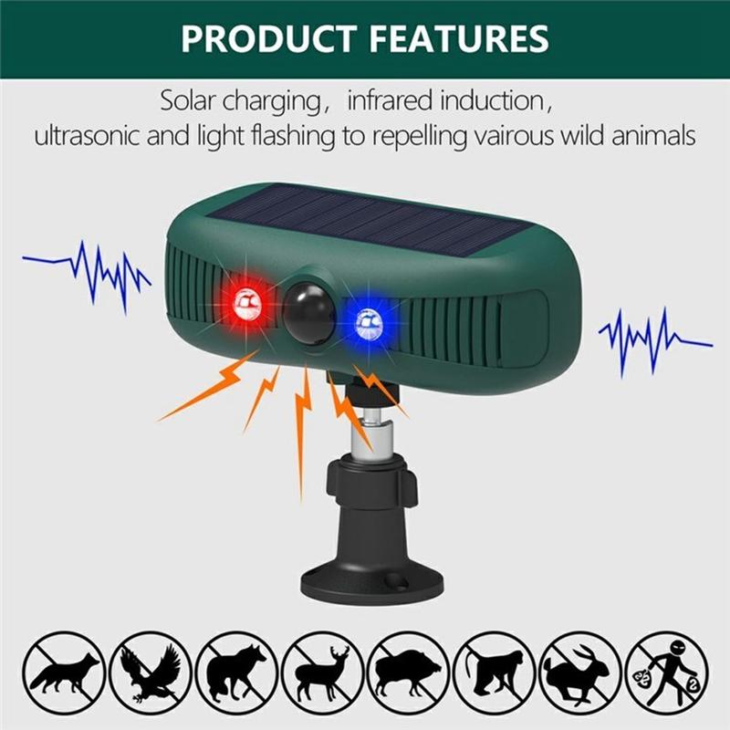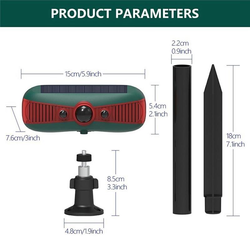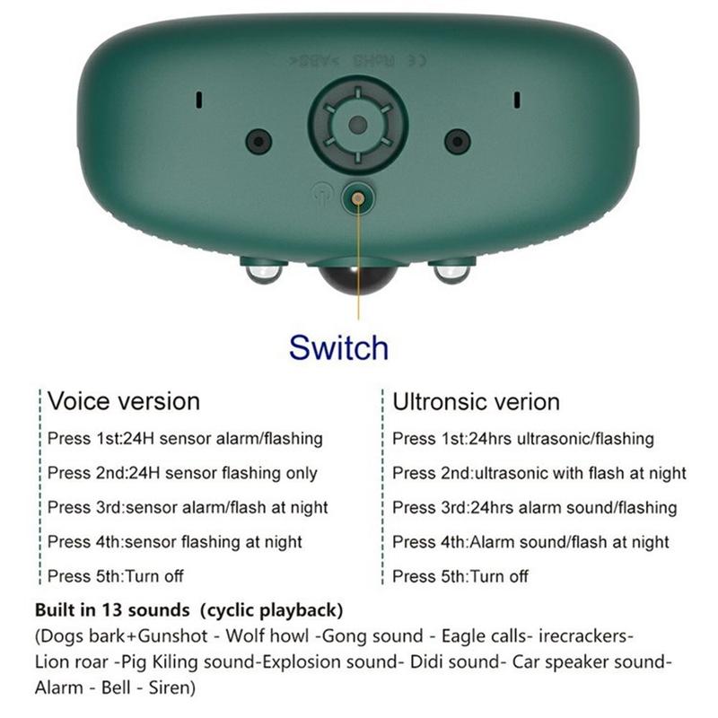 Dieses Gerät verfügt über 12 rotierende Soundeffekte, darunter Sirenen, Hundegebell und schussähnliche Geräusche, und bietet damit eine vielseitige Abschreckungslösung, um Tiere und Schädlinge von Ihrem Grundstück fernzuhalten.