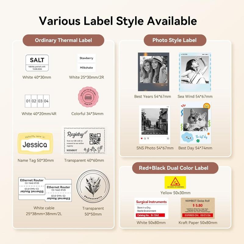 - Kreative Design-App - Mit der NIIMBOT-App haben Sie Zugriff auf mehr als 1500 Symbole, 249 kostenlose Schriftarten und mehr als 1000 Vorlagen sowie auf VIP-exklusive Elemente für eine vollständig individuelle Etikettengestaltung.