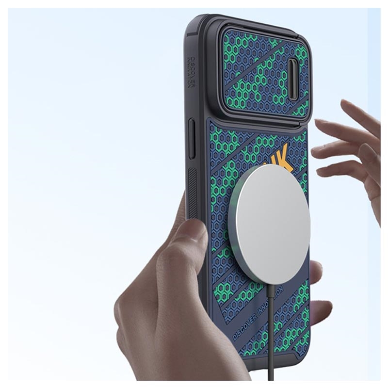 Diese zweilagige Hülle mit einzigartigem 3D-Wabendesign besteht aus flexiblem, stoßdämpfendem TPU-Material und Hartplastik und verfügt über eine integrierte Magnetfolie, die mit Apple MagSafe-Zubehör kompatibel ist. Darüber hinaus verfügt die Hülle über einen Kameraschieber, der die Kamera Ihres iPhone 14 Pro vollständig schützt.
