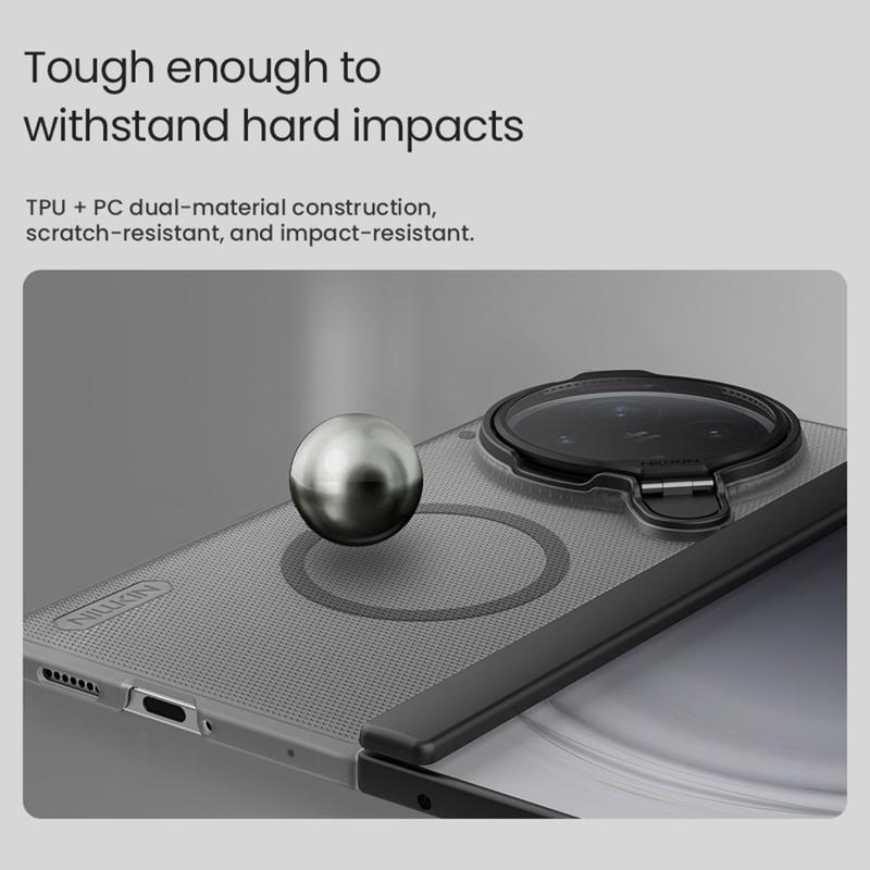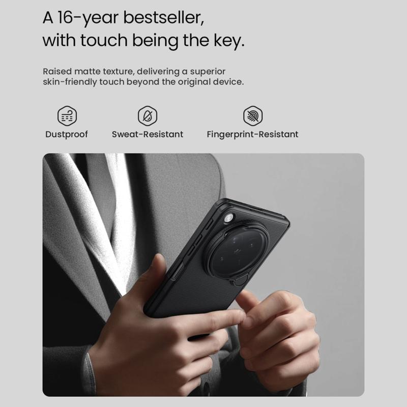 Schützen Sie Ihr Oppo Find N6 stilvoll mit dem Nillkin Super Frosted Shield Prop Case. Diese schlanke und dennoch robuste Handyhülle ist auf Langlebigkeit ausgelegt und schützt vor täglichem Verschleiß und bietet gleichzeitig nützliche Funktionen. Mit einer praktischen Kameralinsenklappe und einem integrierten Kickstand verbindet sie nahtlos robusten Schutz mit modernem Komfort.