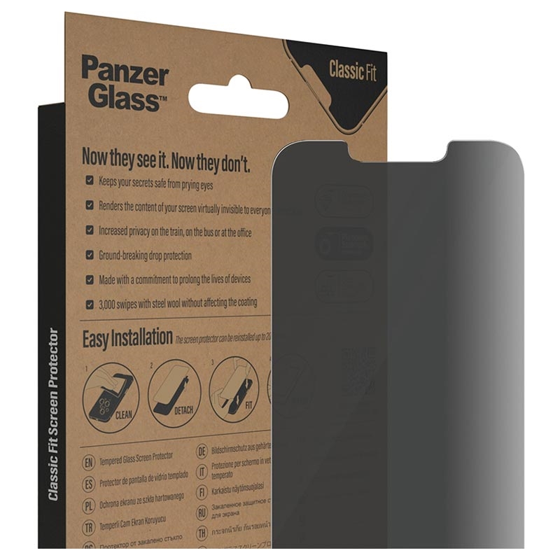 Sorgen Sie mit der Panzerglas Classic Fit Privacy Panzerglass dafür, dass der Bildschirm Ihres iPhone 13, iPhone 13 Pro, iPhone 14 kratzfrei bleibt und alle darauf angezeigten Daten privat bleiben.