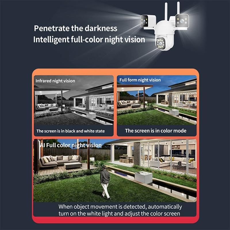 Mit dieser wetterfesten, KI-gesteuerten Sicherheitskamera können Sie jeden Winkel Ihres Grundstücks schützen - Tag und Nacht. Drei unabhängig voneinander einstellbare Objektive bieten einen 360°-Rundumblick, während Sie dank intelligenter Verfolgung und Zwei-Wege-Audio von überall aus verbunden sind und die Kontrolle behalten.
