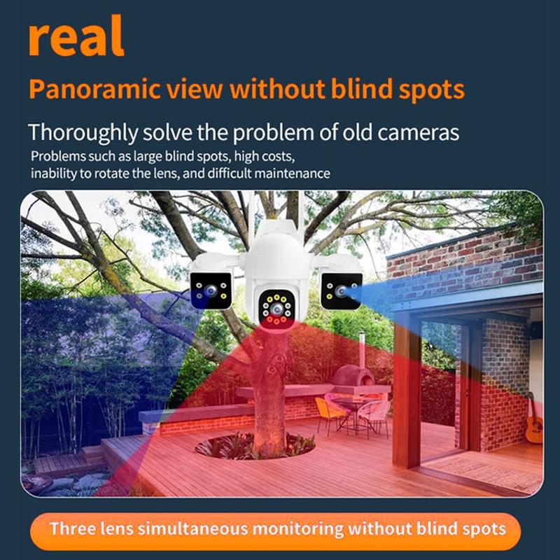 - 360°-Dreifach-Objektivabdeckung - Drei Objektive (25 mm + 12 mm + 4 mm) arbeiten zusammen für eine nahtlose, blickpunktfreie Überwachung im Innen- und Außenbereich.