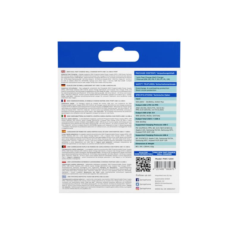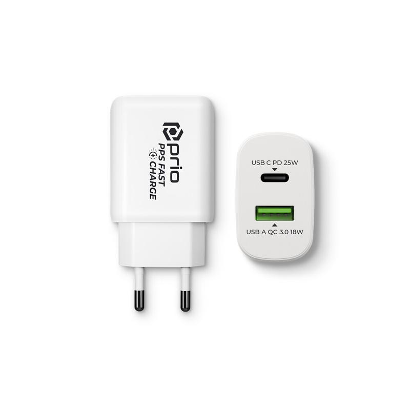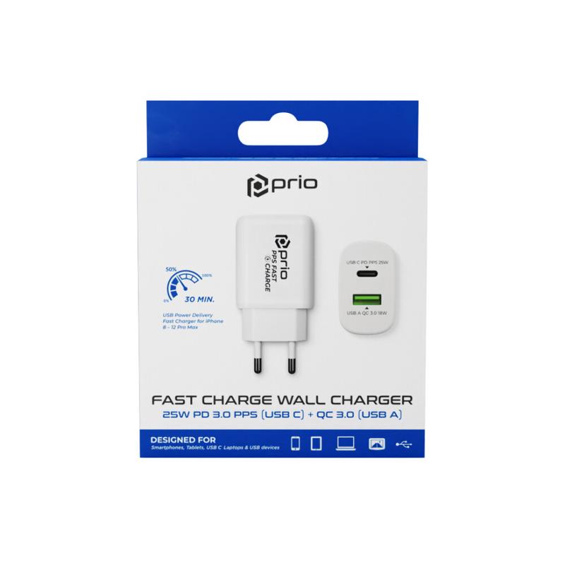 Prio PWC-1204 Schnelles Wandladegerät mit 25W PD USB-C, 18W QC3.0 USB-A Ports