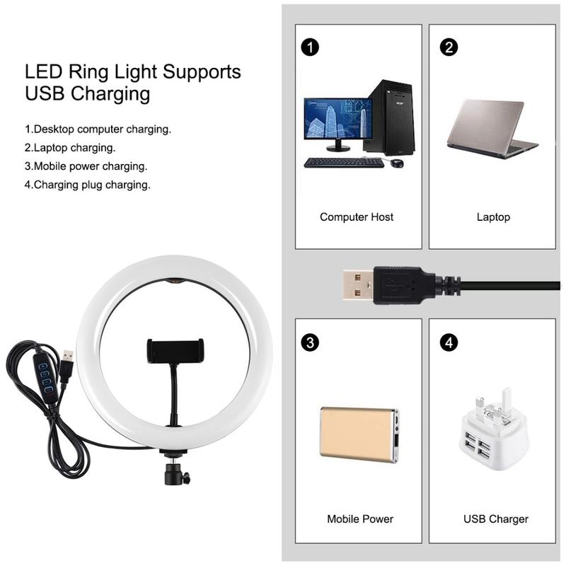 Die USB-Anschlüsse können mit mehreren Geräten verwendet werden, wie z. B. Computer-Host, Laptop, mobile Macht und USB-Ladegerät anschließen. Sie werden in der Lage sein, LED-Ringlicht jederzeit frei zu genießen