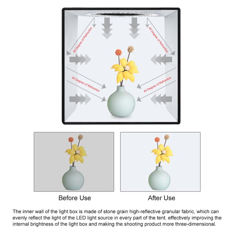 Tragbares Faltdesign, einfacher zu installieren und zu tragen, eingebautes LED-Licht, bietet durchschnittliches Licht, verhindert Schatten und Reflexion auf dem Foto