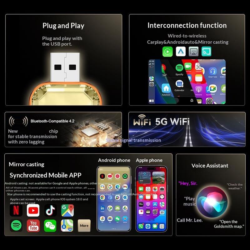 Mit Bluetooth 4.2 und Dualband-WLAN bietet er eine stabile Verbindung mit geringer Latenz für Navigation, Anrufe, Musik und ausgewählte Videowiedergabe. Das kompakte Gehäuse aus eloxiertem Aluminium mit Diamantschliff verleiht ihm ein hochwertiges Aussehen, während die Plug-and-Play-Einrichtung eine sofortige Nutzung ermöglicht.