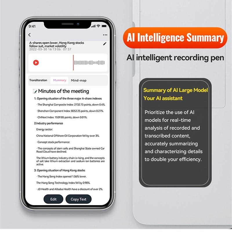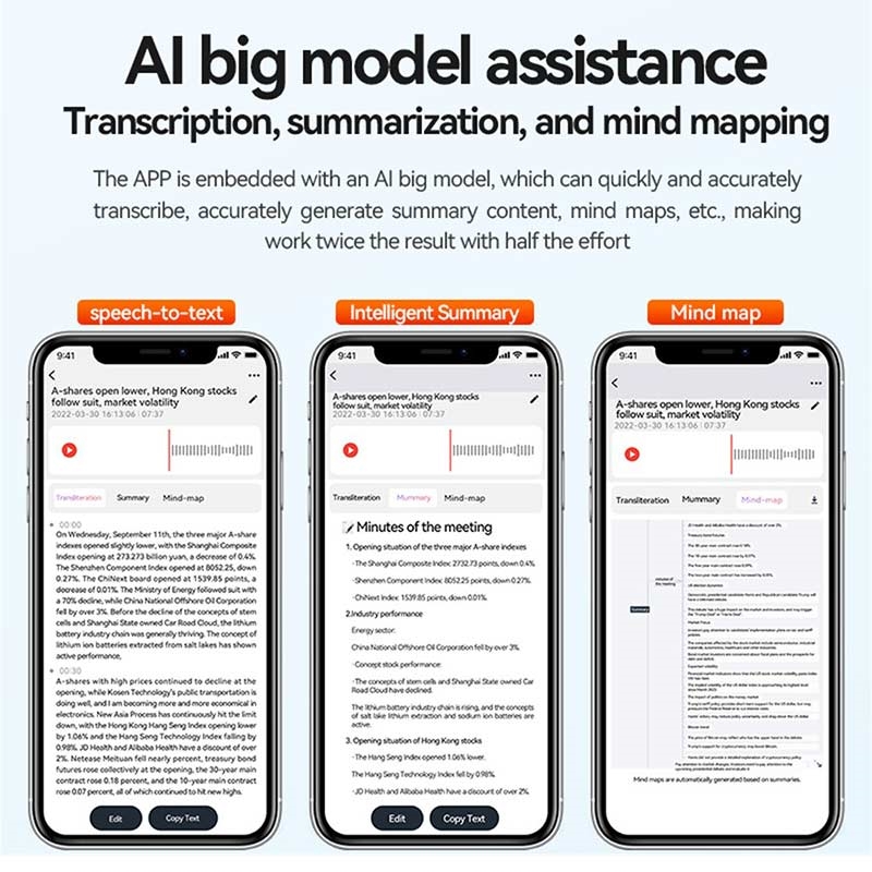 KI-gestützte Transkription: Verbinden Sie sich per Bluetooth mit der AIREC-App und profitieren Sie von Echtzeit-Transkription und -Übersetzung in 188 Sprachen mit ChatGPT-Integration.