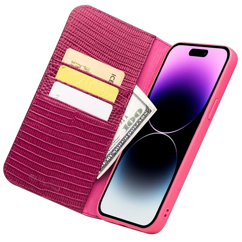 Hersteller: Qialino, Produkttyp: Lederhülle mit Geldbörse, mit Krokodil-Textur, Passend für: iPhone 14 Pro