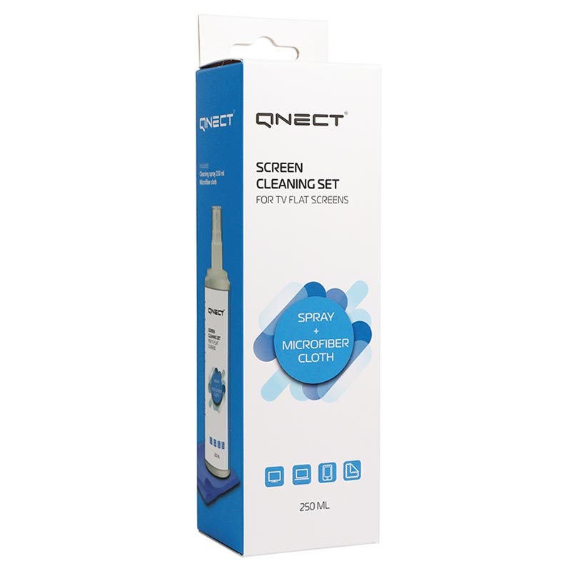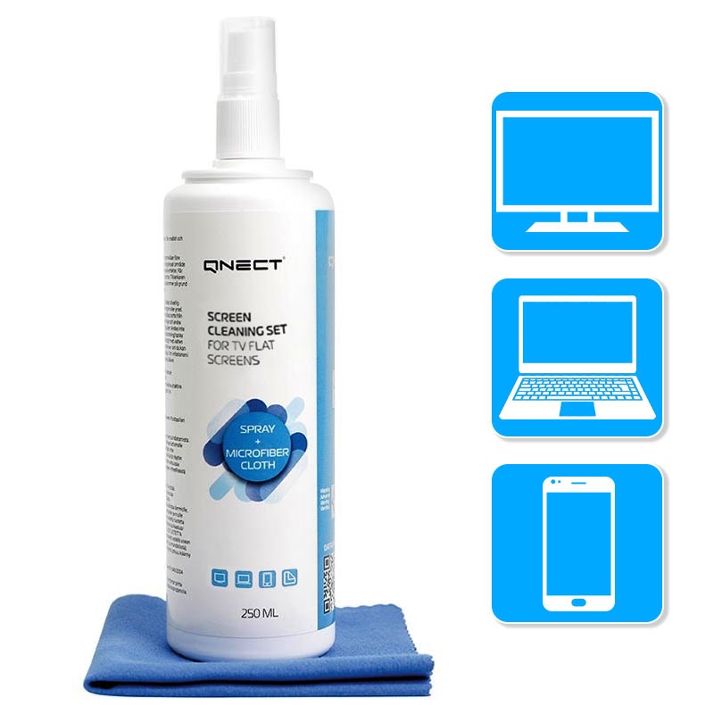 - Das Qnect-Bildschirmreinigungsset kombiniert 250 ml Desinfektionsspray und ein weiches Tuch