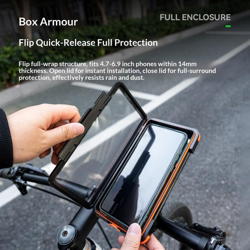 Mit der wasserdichten magnetischen Lenkerhalterung von ROCKBROS können Sie Ihr Smartphone sicher verstauen und bequem im Blick behalten. Die Halterung wurde speziell für Fahrräder und E-Bikes entwickelt und kombiniert ein Flip-Cover-Design mit IPX4-Wasserdichtigkeit, um Ihr Smartphone vor Regen und Spritzwasser zu schützen. Ein starkes Magnetmodul und ein rutschfestes Silikonpad sorgen für eine schnelle Befestigung und stabilen Halt, während das Kugelgelenkdesign eine Drehung des Bildschirms um 360 Grad für den besten Blickwinkel ermöglicht. Spezielle Öffnungen ermöglichen das Aufladen und die Verwendung der Kamera während der Fahrt.