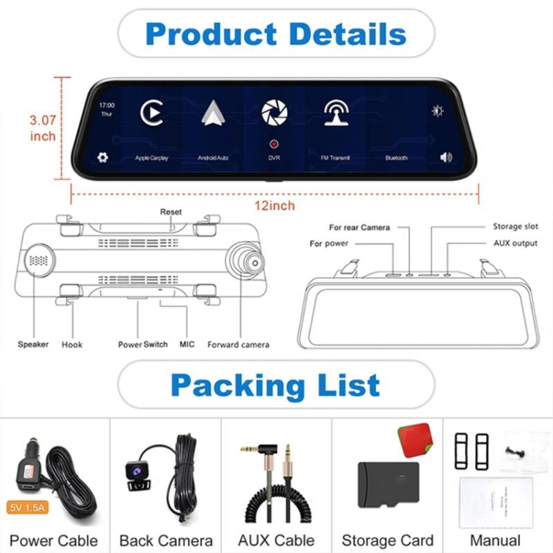 Touchscreen Rückspiegel Dual Dash Cam mit GPS Navigation, Android Auto, CarPlay, Bluetooth, Mirror Link - 9"