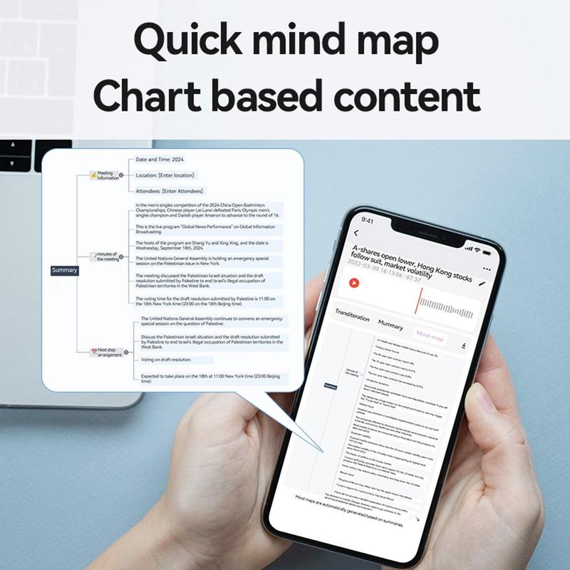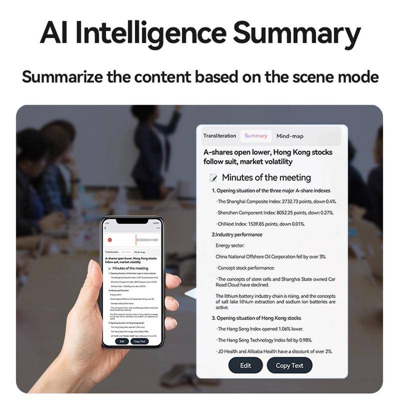 - KI-gestützte Transkription: Verbinden Sie sich mit der AIREC-APP über Bluetooth 5.3 für Echtzeit-Transkription und Übersetzung in 188 Sprachen, unterstützt von ChatGPT.