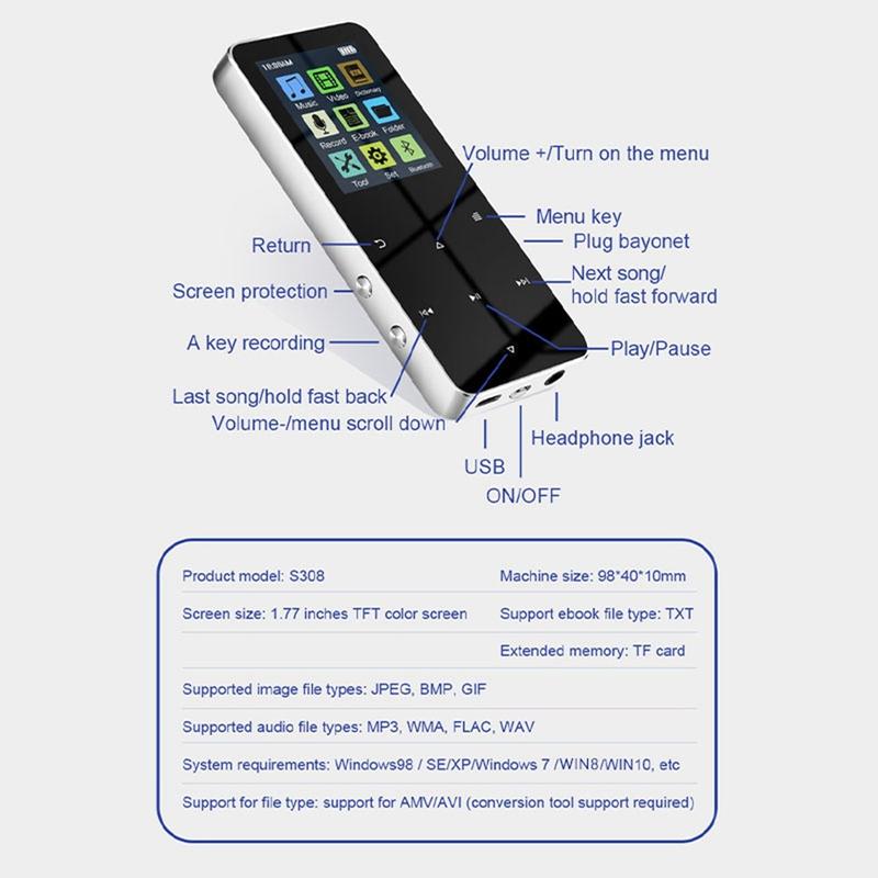 • S308 MP3- und MP4-Musikplayer mit Bluetooth, Tonaufnahmegerät und Wörterbuch - High-Fidelity-Musik und intelligentes Lernen