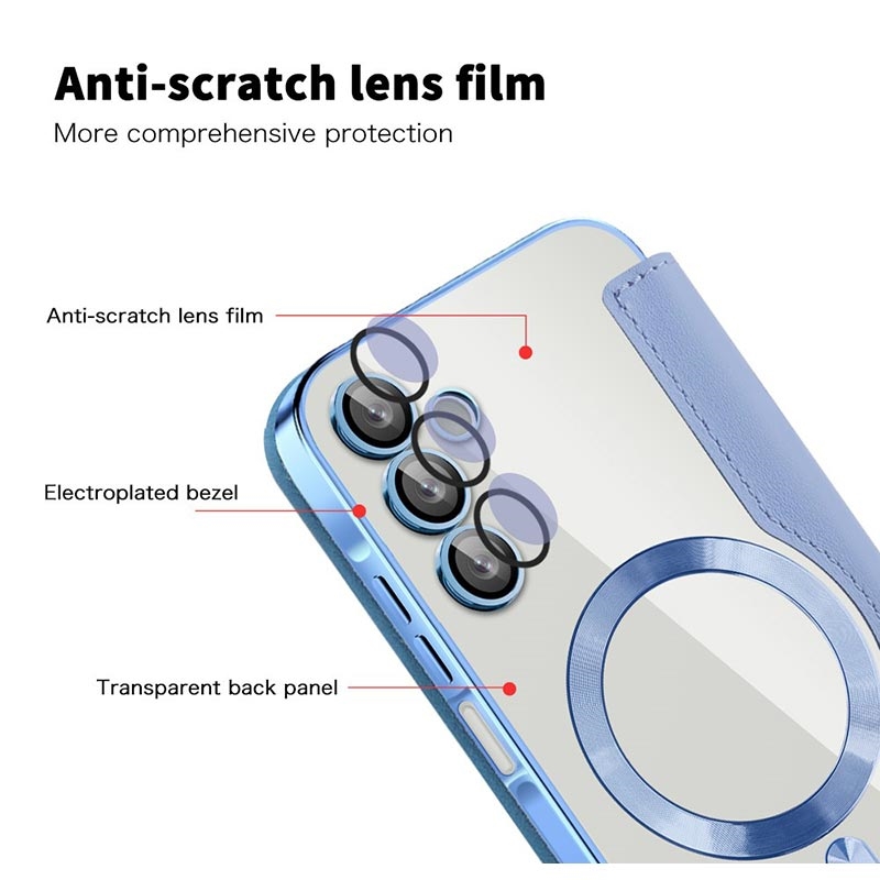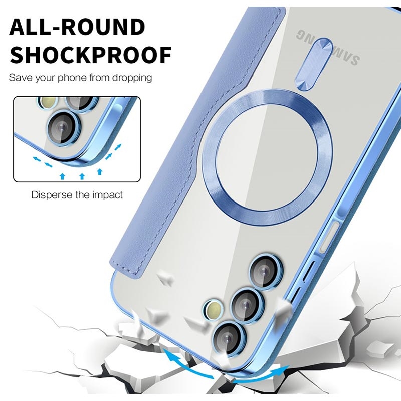 Diese Premium-Hülle für das Samsung Galaxy A15 ist aus hochwertigem TPU, Acryl und Polyurethan gefertigt und wird in einem feinen Verfahren hergestellt, um eine zarte und exquisite Oberfläche zu gewährleisten. Es ist mit einem praktischen Kartenschlitz für einfaches Durchziehen und Ausgeben unterwegs ausgestattet und verfügt über einen starken Magneten für automatisches Schließen, wodurch es sicher und bequem ist, Gegenstände im Inneren zu verwalten. Diese Samsung Galaxy A15-Hülle bietet effektiven Schutz vor täglicher Abnutzung, Kratzern, Schrammen und Schrammen, während die fortschrittliche RFID-Blockierungstechnologie im Kartenschlitz dafür sorgt, dass Ihre persönlichen Daten vor Diebstahl geschützt sind. Darüber hinaus ist der integrierte Magnetring mit dem kabellosen MagSafe-Ladeverfahren kompatibel, so dass Sie Ihr Samsung Galaxy A15 aufladen können, ohne die Tasche abnehmen zu müssen.