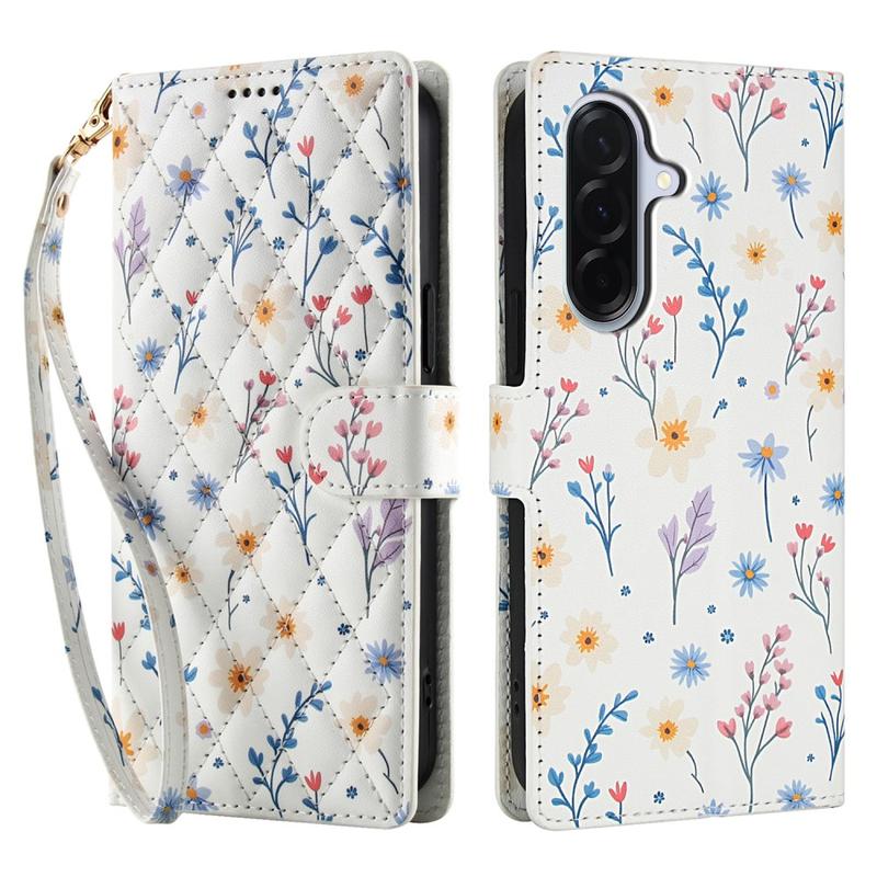 Erfrischen Sie Ihr Samsung Galaxy A57 mit einem schlanken Flip Wallet, das sicheren Schutz mit Alltagstauglichkeit verbindet. Die rautenförmig genähte Vorderseite und das winzige Blumenmuster sorgen für eleganten Stil, während eine weiche TPU-Schale Stürze abfedert und eine Polyurethanhülle vor Kratzern schützt. Mehrere Kartenfächer, ein Fach für Bargeld und eine mitgelieferte Handschlaufe machen diese Tasche zu einer Komplettlösung für unterwegs, auf Reisen oder beim Ausgehen.