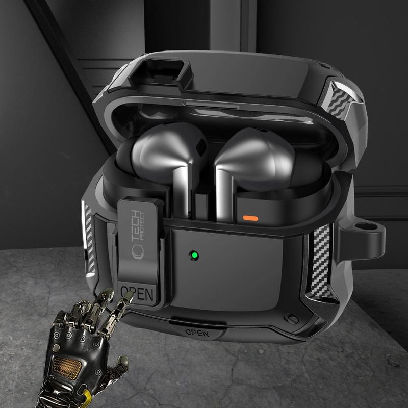 Das Tech-Protect Carbonox Case bietet ultimativen Schutz und Stil für Ihre Samsung Galaxy Buds3, Galaxy Buds3 Pro, Galaxy Buds3 FE. Aus strapazierfähigem TPU und PC-Materialien gefertigt, schützt diese gepanzerte Hülle Ihre AirPods vor Stößen, Kratzern und Fingerabdrücken. Der sichere Verschlussmechanismus sorgt dafür, dass Ihre AirPods sicher bleiben, während das funktionale Design sowohl kabelgebundenes als auch kabelloses Laden unterstützt. Das Gehäuse verfügt über präzise Aussparungen, eine sichtbare LED auf der Vorderseite und eine hohle Unterseite für nahtloses Laden. Ausgestattet mit einem abnehmbaren Schlüsselbund und Karabinerhaken, kombiniert das Carbonox Case Funktionalität mit einem eleganten, robusten Look.