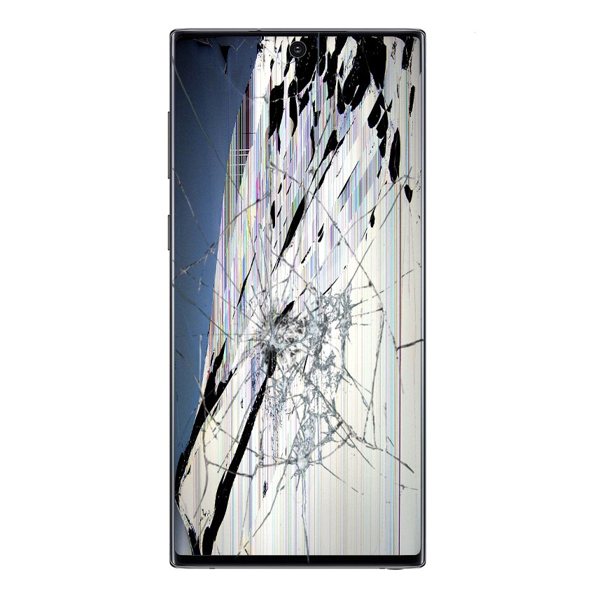 • Ihr Samsung Galaxy Note 10 sieht aus wie auf diesem Bild? Wenn der Touchscreen nicht reagiert, schwer beschädigt ist, das LCD-Display ungewöhnliche Zeichen anzeigt oder gar nicht funktioniert, dann benötigt Ihr Gerät eine LCD-Touchscreen-Reparatur.