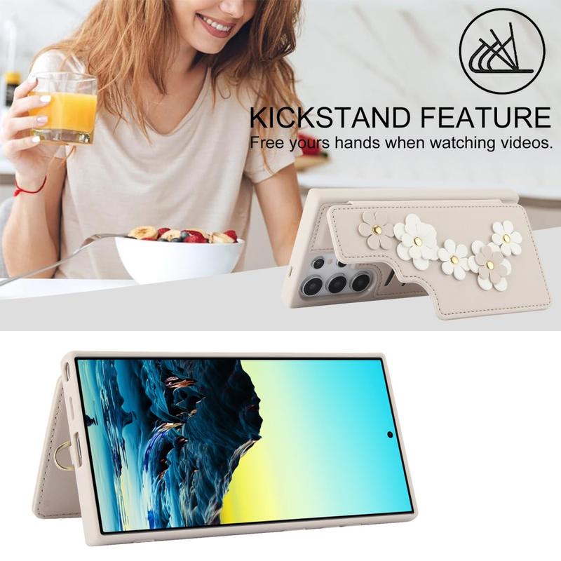 Das Samsung Galaxy S24 Ultra Flower Decor Case ist aus Polyurethan und TPU-Materialien gefertigt und bietet dauerhaften Schutz. Das stilvolle Design zeigt Blumen auf der Rückseite des Gehäuses und der Handschlaufe. Es verfügt über einen Kartensteckplatz für bis zu 4 wichtige Karten, und der Kartenhalter auf der Rückseite kann auch als Ständer für verschiedene Betrachtungswinkel verwendet werden. Der Magnetknopf hält die Karten sicher, während präzise Aussparungen den vollen Zugang zu allen Tasten und Anschlüssen ermöglichen. Schützen Sie Ihr Handy vor täglichen Schäden mit dieser praktischen Tasche, die mit einer Handschlaufe und einem Schultergurt für einfaches Tragen ausgestattet ist.