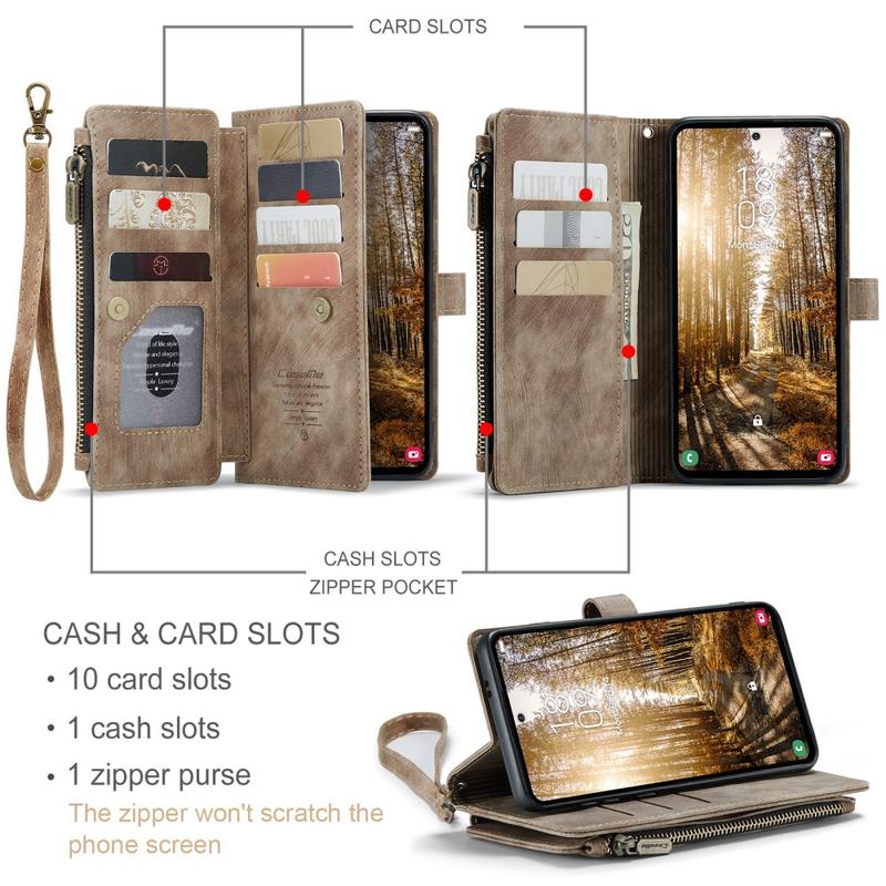 Die Caseme C30 multifunktionale Brieftaschenhülle für das Samsung Galaxy S25+ bietet außergewöhnlichen Rundumschutz und ein exklusives, raffiniertes Design. Diese elegante Hülle besteht aus hochwertigem Polyurethan, verstärkt mit einer stoßfesten TPU-Innenhülle, die sich perfekt an Ihr Samsung Galaxy S25+ anschmiegt. Die Caseme C30 Brieftasche ist mit zahlreichen Kartenfächern, einem großen Geldfach innen und einer Außentasche mit Reißverschluss ausgestattet, die alle durch einen sicheren Magnetverschluss geschützt sind.