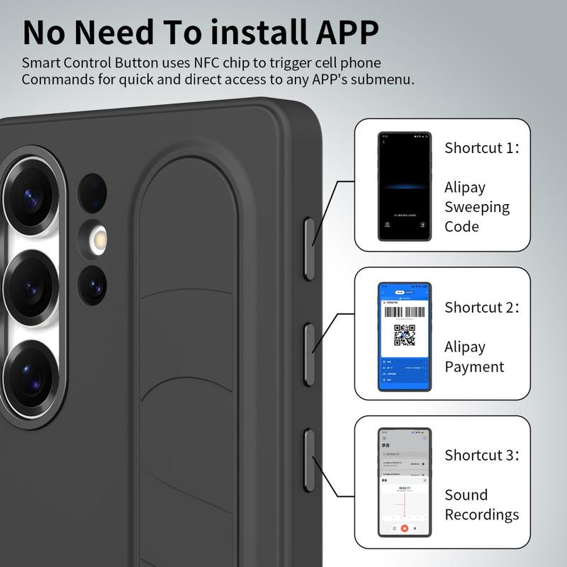 Ausgestattet mit drei intelligenten NFC-fähigen Tasten ermöglicht diese intelligente Hybrid-Hülle den schnellen Zugriff auf Apps wie Kamera, Blitzlicht oder Screenshot mit einem einzigen Druck. Kein Aufladen, keine zusätzlichen Apps - nur einfache, sofortige Funktionalität.