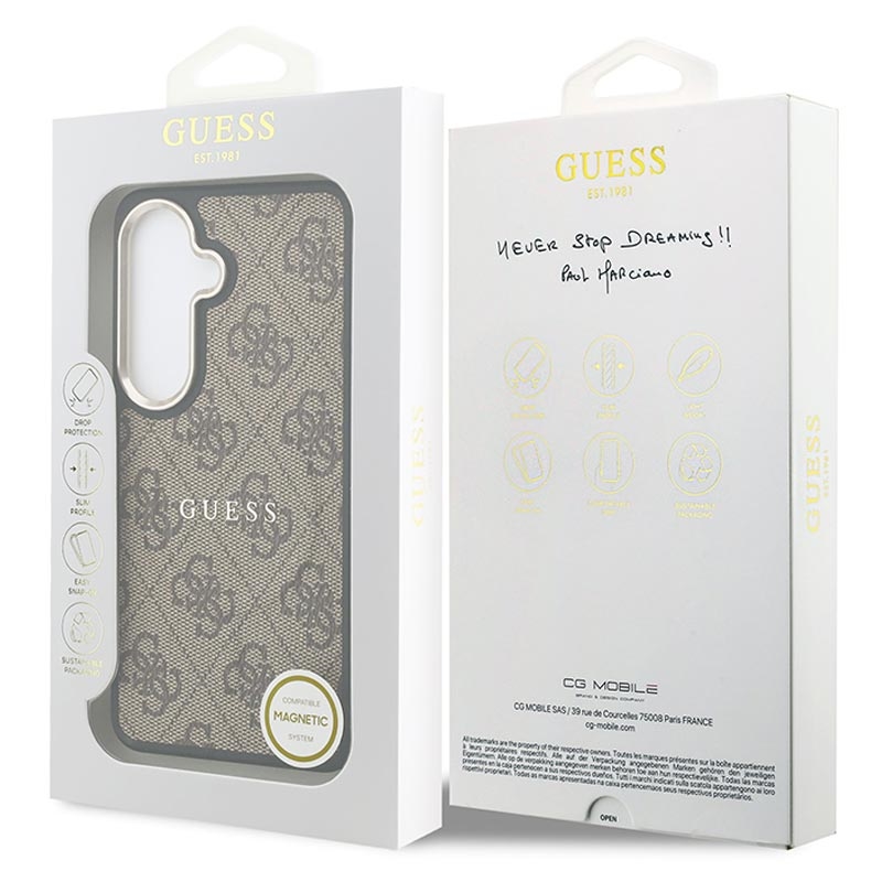 Wenn Sie eine Hülle suchen, die hochwertig aussieht und gleichzeitig praktisch ist, ist diese Guess-Hülle genau das Richtige für Sie. Sie bietet einen sicheren Halt, eine präzise Passform und MagSafe-Kompatibilität, sodass Sie Ihr Smartphone weiterhin kabellos aufladen und Zubehör ohne Probleme verwenden können. Der goldene Kamerarahmen und der ikonische 4G-Aufdruck sorgen für ein stilvolles Finish, das auffällt, ohne auffällig zu sein.
