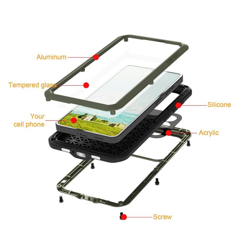 - Merkmale: Eingebauter Bildschirmschutz, erhöhte Ränder, Schraubverschluss-Design, kabelloses Laden möglich