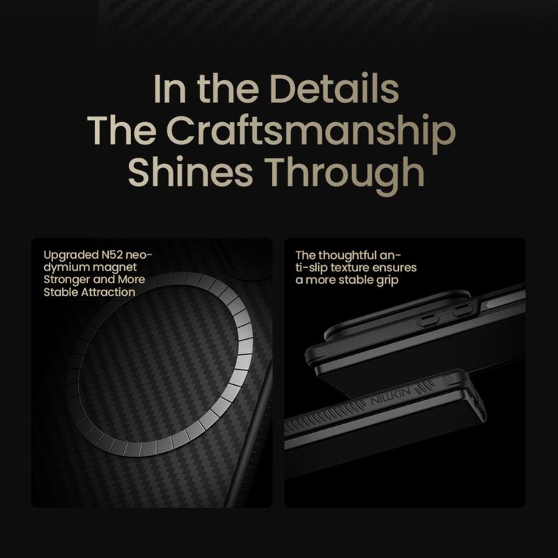 Geben Sie Ihrem Samsung Galaxy Z Fold7 den gleichen Schutz, den Sie aus der Luft- und Raumfahrt kennen. Das Nillkin CarboProp verbindet "schwarz-goldene" Aramidfasern mit stoßabsorbierendem TPU, um eine federleichte Hülle zu schaffen, die alltäglichen Stürzen standhält und dabei die glatte Silhouette des Telefons beibehält. Ein integrierter Kamerarahmen aus Metall dient als freihändiger Ständer, und die integrierten Magnete lassen sich perfekt an MagSafe-Ladegeräten und -Zubehör befestigen - zusätzliche Platten sind nicht erforderlich.