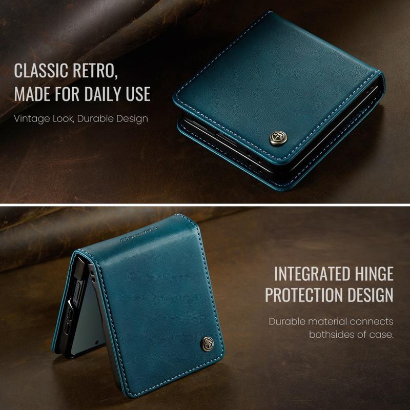 Das Wallet Case der CASEME 033 Serie für das Samsung Galaxy Z Flip7 besteht aus Polyurethan mit Kalbslederstruktur und TPU. Es bietet umfassenden Schutz vor Kratzern, Stößen und alltäglicher Abnutzung und besticht gleichzeitig durch sein hochwertiges, elegantes Design.