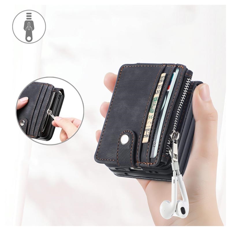 Diese ultra-stylische Schutzhülle verleiht Ihrem Samsung Galaxy Z Flip5 zeitlose Eleganz. Gleichzeitig garantiert eine robuste plastische innere Hülle, die mit hochwertigem Polyurethan beschichtet ist, für Ihr Samsung Galaxy Z Flip5 einen zuverlässigen Allround-Schutz. Diese Retro -Hülle verfügt über eine abnehmbare Brieftasche mit drei Kartensteckplätzen und einer Reißverschlusspocke, um sicher Geld zu speichern.