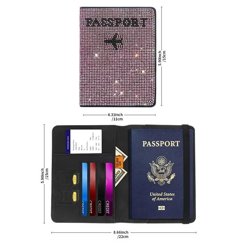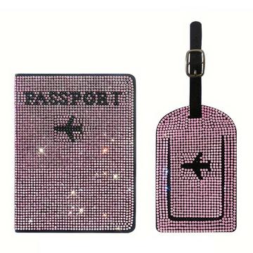 Reisen Sie stilvoll mit dem strassbesetzten Reisepasshalter- und Gepäckanhänger-Set, einem glamourösen Accessoire-Duo, das für Eleganz und Zweckmäßigkeit steht. Gefertigt aus strapazierfähigem Polyurethan und verziert mit funkelnden Strasssteinen, bringt dieses Set Luxus und Glanz auf jede Reise.