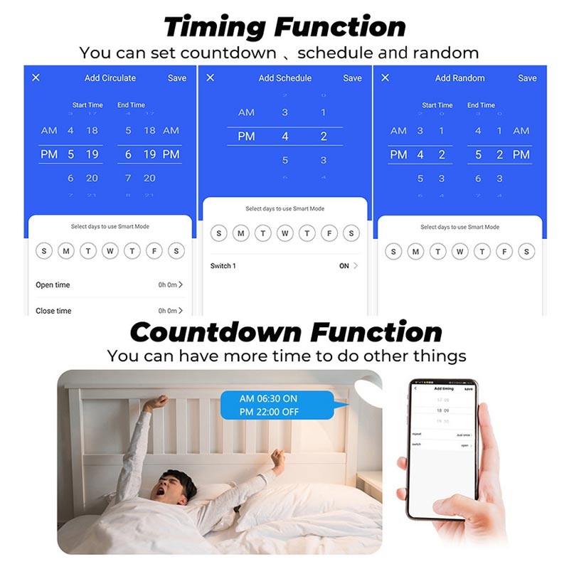 Erstellen Sie personalisierte Routinen – schalten Sie zum Beispiel den Wohnzimmerventilator bei Sonnenaufgang ein oder das Nachtlicht Ihres Kindes automatisch vor dem Schlafengehen aus. Der Countdown-Timer und die „Einstellen und Vergessen“-Funktion sorgen dafür, dass Sie sich nie wieder Sorgen machen müssen, Geräte eingeschaltet zu lassen.