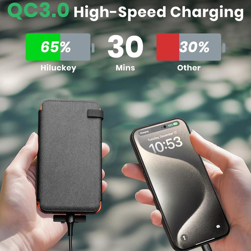 Die Powerbank unterstützt QC3.0-Schnellladen und kann kompatible Geräte deutlich schneller aufladen als herkömmliche Ladegeräte. Dank mehrerer Anschlüsse können bis zu drei Geräte gleichzeitig aufgeladen werden, was sie zu einer praktischen Stromquelle für Outdoor-Abenteuer oder alltägliche Reisen macht. Eine integrierte LED-Taschenlampe mit langer Leuchtdauer bietet zusätzliche Sicherheit beim Camping und in Notfällen.