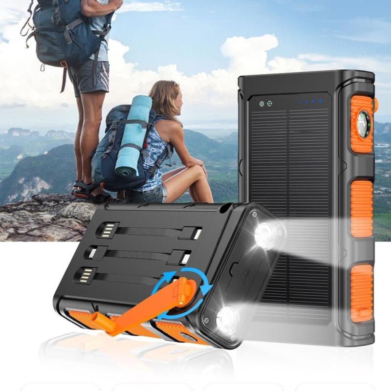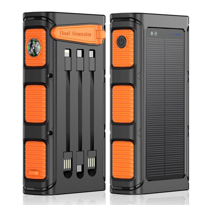 • Solar-Powerbank mit Handkurbel, 30000mAh - tragbares Outdoor-Ladegerät mit PD-Schnellladefunktion (20 W), Taschenlampe, SOS-Alarm, Kompass und integrierten Kabeln
