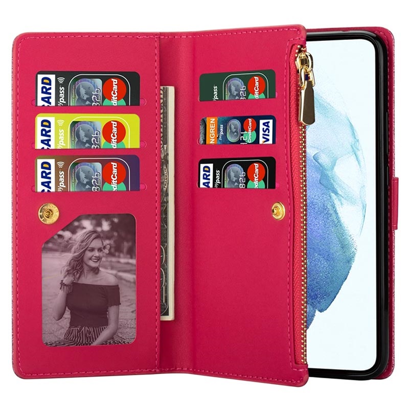 Kleiden Sie Ihr Samsung Galaxy S22+ 5G in dieses traumhafte Wallet Case mit vielen praktischen Fächern. Dieses Wallet Case ist mit einer stoßfesten TPU-Innenschale ausgestattet und bietet einen hervorragenden Rundumschutz gegen Stöße und Dellen. Neben mehreren Kartenfächern und Geldfächern bietet diese Brieftasche eine Reißverschlusstasche, in der Sie Bargeld und Kleinigkeiten aufbewahren können. Das glänzende Design lässt Ihr Samsung Galaxy S22+ 5G umwerfend aussehen, während ein abnehmbarer Riemen es Ihnen ermöglicht, es sicher und elegant zu tragen.