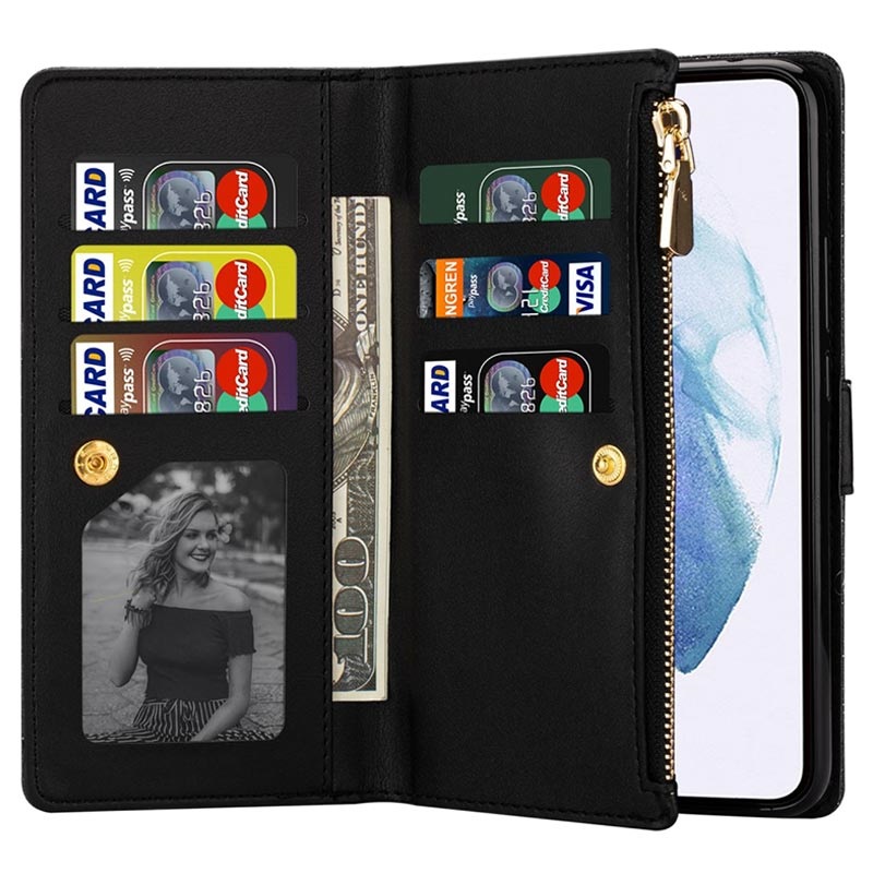 Kleiden Sie Ihr Samsung Galaxy S22+ 5G in dieses traumhafte Wallet Case mit vielen praktischen Fächern. Dieses Wallet Case ist mit einer stoßfesten TPU-Innenschale ausgestattet und bietet einen hervorragenden Rundumschutz gegen Stöße und Dellen. Neben mehreren Kartenfächern und Geldfächern bietet diese Brieftasche eine Reißverschlusstasche, in der Sie Bargeld und Kleinigkeiten aufbewahren können. Das glänzende Design lässt Ihr Samsung Galaxy S22+ 5G umwerfend aussehen, während ein abnehmbarer Riemen es Ihnen ermöglicht, es sicher und elegant zu tragen.