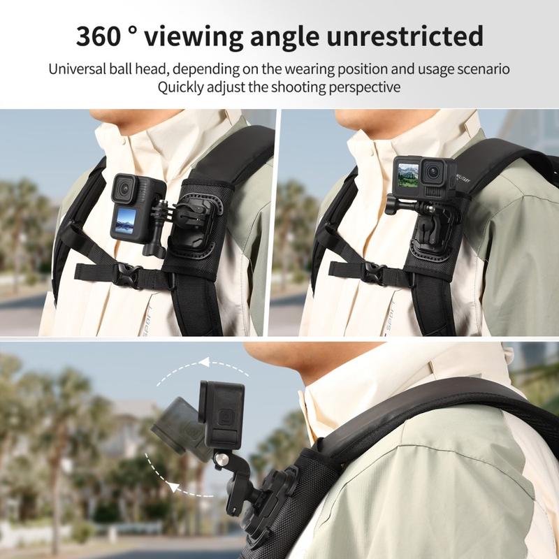Die Halterung verfügt außerdem über einen universellen Kugelkopf für eine flexible Winkeleinstellung, wodurch es einfacher wird, deine Kamera je nach Trageweise des Rucksacks für POV-Aufnahmen oder Aufnahmen aus seitlichem Winkel zu positionieren. Mit ihrem leichten Design, der strapazierfähigen Konstruktion aus Nylon und Fasern sowie der Schnellverschlussfunktion ist sie ein praktisches Zubehör für Kreative und Outdoor-Nutzer, die sich einfacheres mobiles Filmen wünschen.