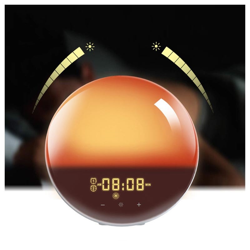 Schlafhilfefunktion: Simuliertes Sonnenuntergangslicht hilft beim Einschlafen; Musik zum Einschlafen, integrierte 8 Arten natürlicher Musik mit weißem Rauschen, Sie können auch den UKW-Radio-Audiokanal als Schlafmusik wählen