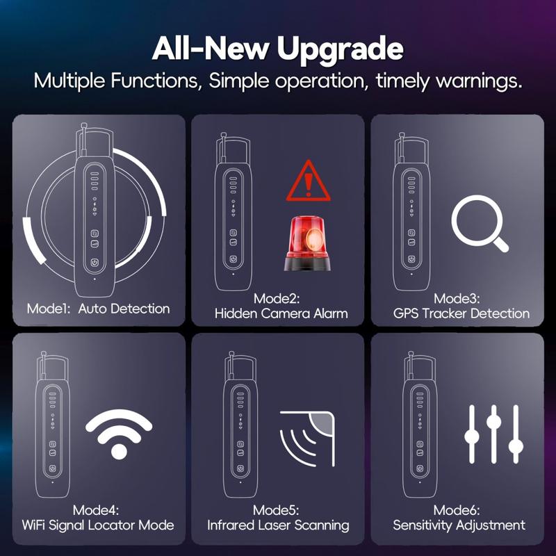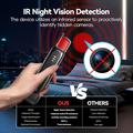 - Erkennungsmodi umfassen WLAN-Signalscan, Infrarotkamera-Erkennung, Abhörschutz-Scan, Laserkamera-Erkennung und Erkennung magnetischer Ortungsgeräte