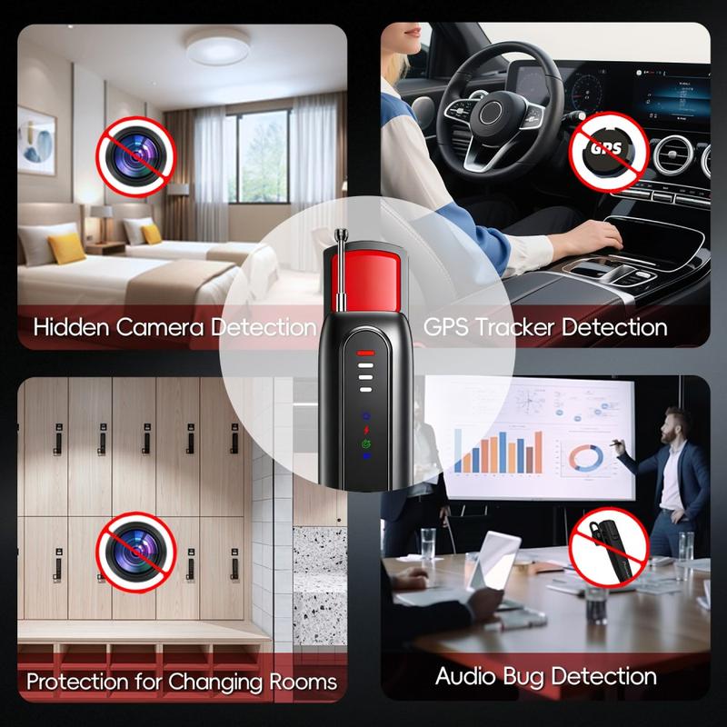 Schützen Sie Ihre Privatsphäre überall mit dem multifunktionalen versteckten Kameradetektor T07. Dieses kompakte Handgerät wurde für Reisende, Berufstätige und alle entwickelt, denen ihre persönliche Sicherheit am Herzen liegt. Es hilft dabei, versteckte Kameras, drahtlose Sender und verdächtige Ortungsgeräte in Hotels, Büros, Besprechungsräumen, Mietwohnungen oder Fahrzeugen aufzuspüren.